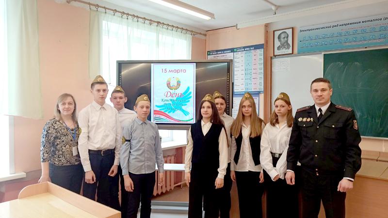 В первой городской школе организовали занятие, посвященное Дню Конституции Республики Беларусь. Как рассказал помощник начальника Климовичского отдела охраны по идеологической работе и кадровому обеспечению Евгений Фоменков, встречу с учащимися правового 8 «Б» класса он провел совместно с депутатом районного Совета депутатов Людмилой Байковой.