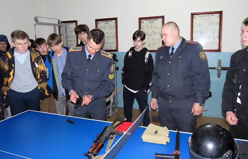 Со школьниками общались заместитель начальника ОВД по идеологической работе и кадровому обеспечению Александр Малюга, старший инспектор группы кадров Дмитрий Панасенко, исполняющая обязанности начальника инспекции по делам несовершеннолетних Наталья Агеева, председатель ветеранской организации отдела внутренних дел Александр Волков и курсант Могилевского института МВД Иван Калин.