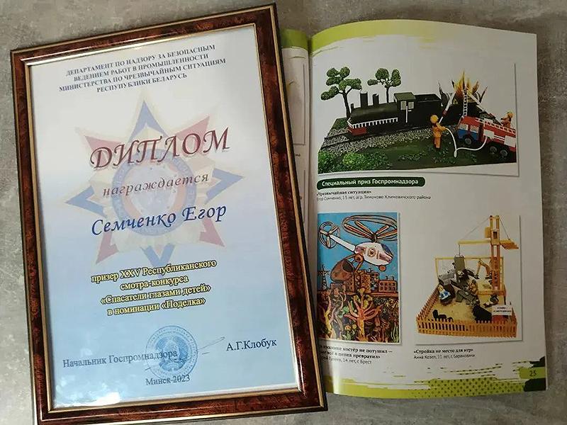 В смотре-конкурсе участвовал и наш земляк Егор Семченко. Учащийся Тимоновской средней школы Климовичского района был награжден специальным призом Госпромнадзора в номинации «Поделка» в возрастной категории 10-13 лет (работа «Чрезвычайная ситуация»).
