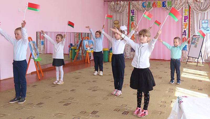 Под звуки «Марша» ребята вошли в музыкальный зал. Прочтя стихи о главных символах нашей страны, детки с гордостью слушали Гимн Республики Беларусь.