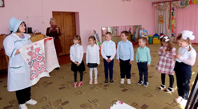 И вот осталась одна станция — «Площадь Хлеборобная». В гости пришел Хлебороб с подносом вкусно пахнущей сдобы. Хлебороб рассказал, как от маленького зернышка, пройдя долгий путь, на наших столах появляется хлеб. Сюрпризом гостю стало то, что детки знают, благодаря кому булочки попадают в магазин. Рассказали о трактористах, комбайнерах, агрономах. Хлебороб в ответ подсказала, что много-много зерен отправляется на элеватор, чтобы потом попасть на мукомольный комбинат. А после белая как снег мука в машинах едет на хлебопекарни.