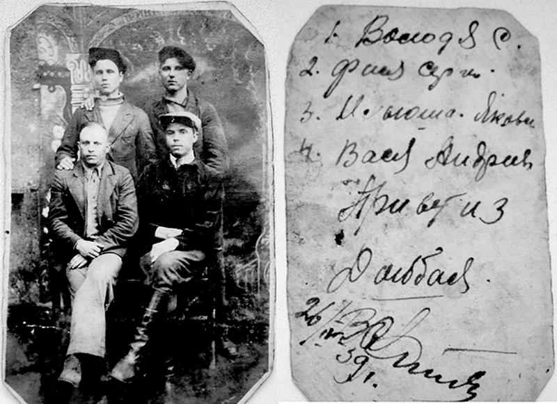 …Мечта увидеть фото сбылась неожиданно. Незнакомая женщина, семья которой после войны уехала из моей белорусской деревни, опубликовала в сети Интернет фото родственников и друзей. Филипп был на одном из них, во втором ряду справа: ватник на косоворотку, под картузом озорные глаза… На обороте: «…Фил. Сергей. Привет из Донбасса». 26 апреля 1939 года — моему двоюродному деду Филиппу двадцать три года».