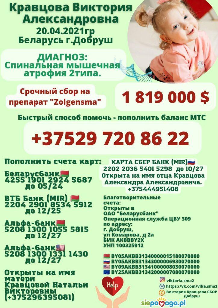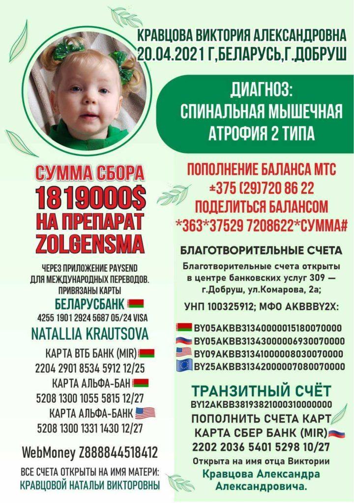 Мы, Кравцова Наталья Викторовна и Кравцов Александр Александрович, проживающие в РБ, г.Добруш, просим Вас о помощи. У нашей дочери Кравцовой Виктории Александровны (20.04.2021г.р) в 1 год и 4 месяца диагностировали редкое генетическое заболевание – спинальная мышечная атрофия второго типа.
