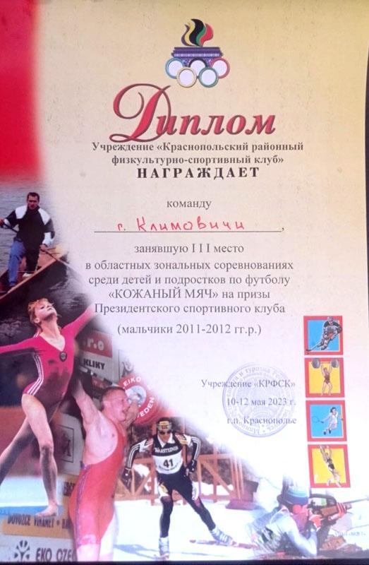 В соревнованиях по футболу на призы президентского спортивного клуба «Кожаный мяч» сборная команда из нашего района, в состав которой вошли ребята 2011-2012 г. р., заняла третье место в зональном этапе, который проходил в Краснополье.