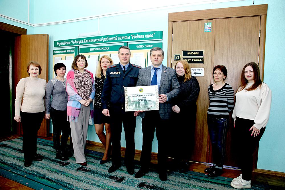 Климовичский отдел Департамента охраны МВД Республики Беларусь поздравил коллектив районной газеты «Родная ніва» с профессиональным праздником и вручил Благодарственное письмо с пожеланием успехов в творческой деятельности.