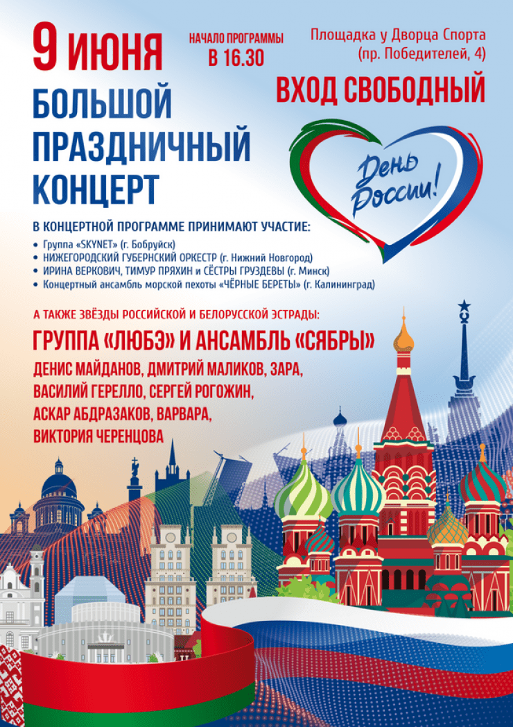 12 июня в Российской Федерации отмечается государственный праздник — День России. Большой праздничный концерт, приуроченный к этой дате, состоится 9 июня в Минске.