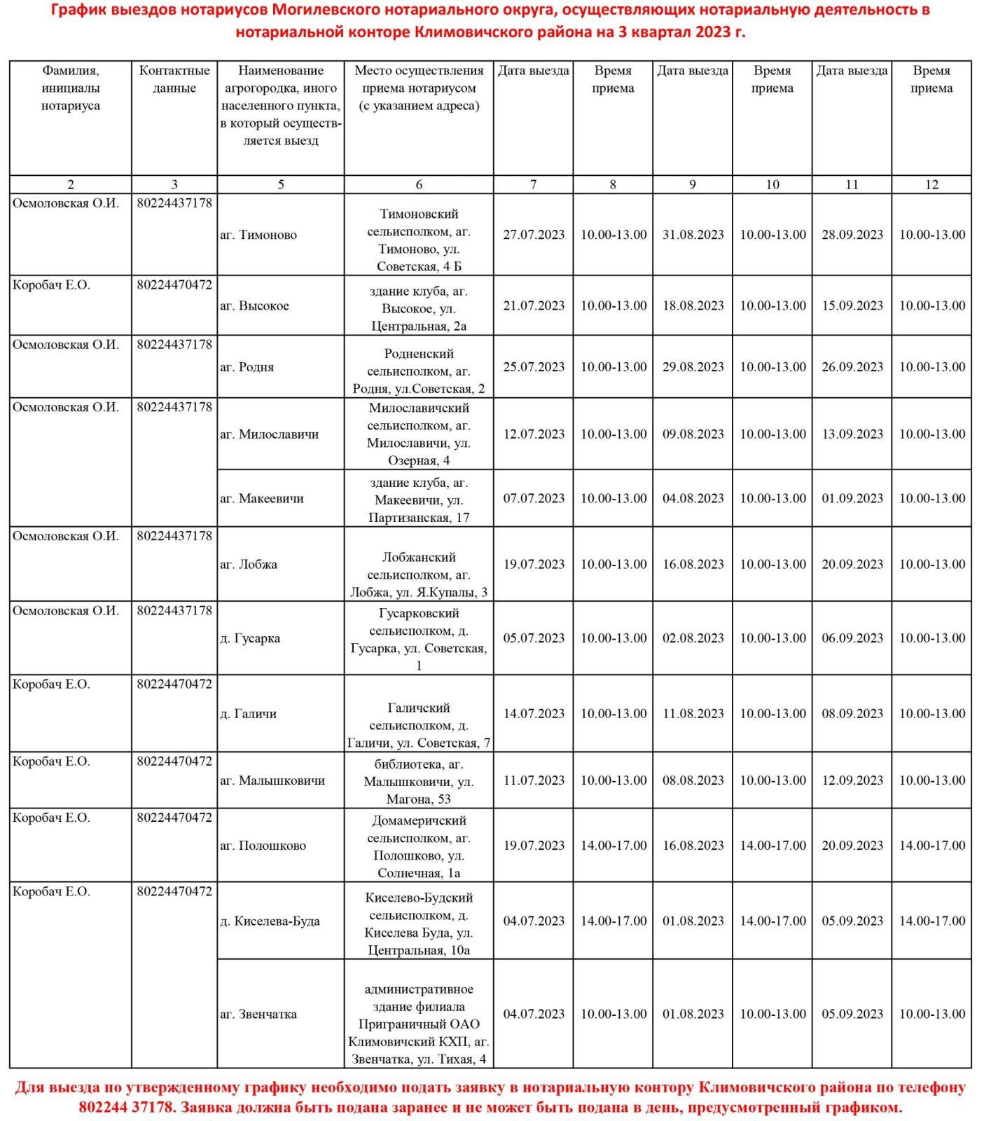 В нотариальной конторе Климовичского района Могилевского нотариального округа сообщили о графике выезда нотариусов в агрогородки и сельсоветы Климовичского района в третьем квартале 2023 года: