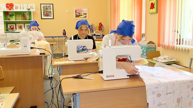 В швейном цеху трудятся десять девочек, по пять в каждой смене. Занимаются пошивом постельного белья, скатертей, косынок и кухонных полотенец.