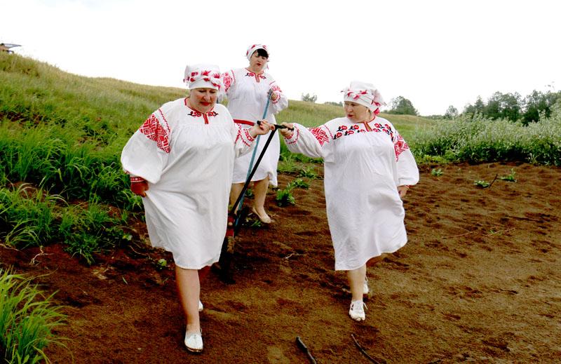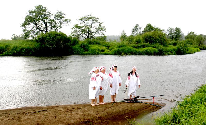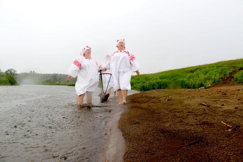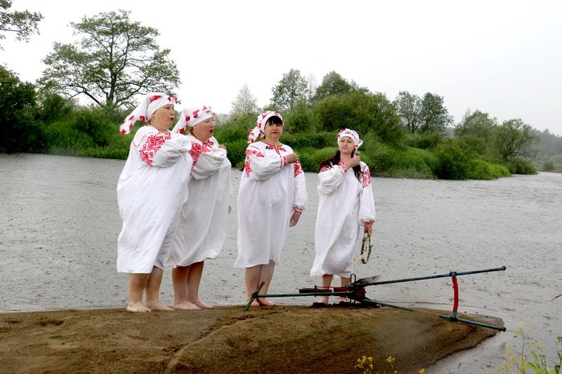 В праздничных рубашках женщины зашли в воду и стали тянуть по дну реки плуг — «пахали воду». Причем две тянули плуг, третья шла за ним, а еще одна пугой погоняла, а остальные пели обрядовую песню. Двигались участницы ансамбля вдоль берега, старательно пахали реку.