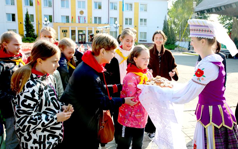 По традиции гостей встречали председатель Климовичского райисполкома Дмитрий Хайновский, председатель районного Совета депутатов Наталья Асмоловская, заместитель председателя райисполкома Наталья Глушакова. Гостям передали хлеб-соль и пожелали успешного выступления на фестивале.