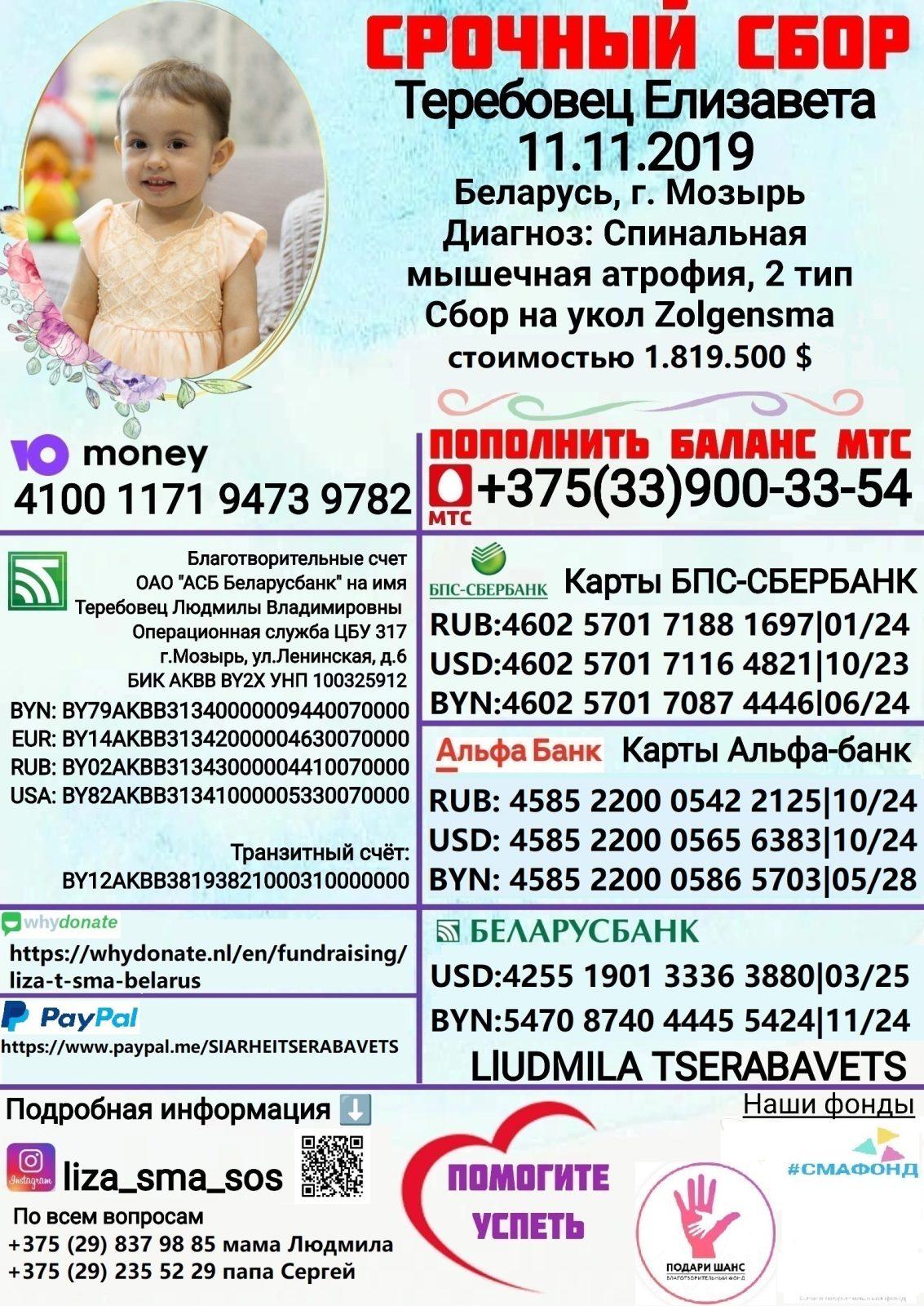 Помочь Лизавете Теребовец можно любым удобным для Вас способом: