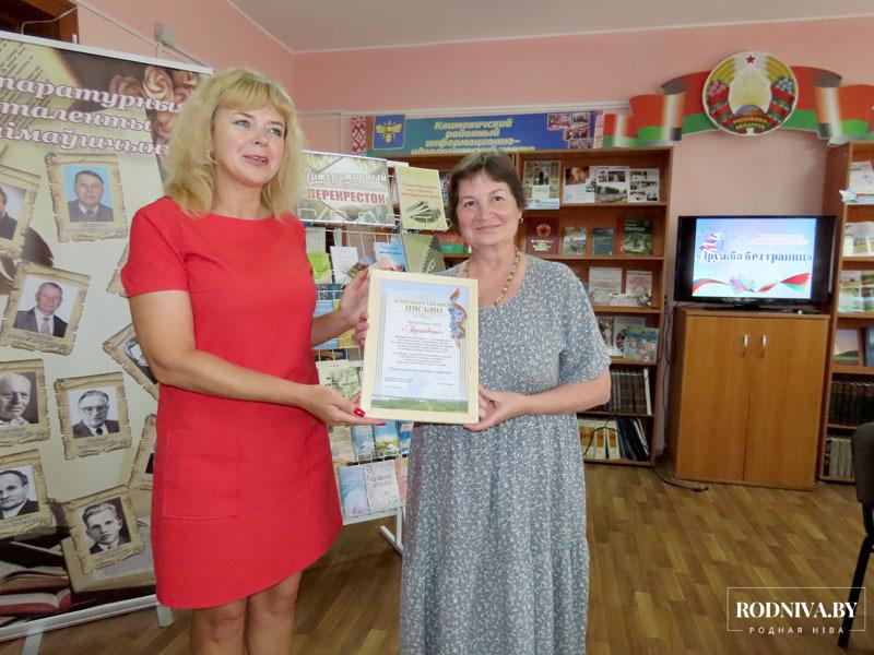 Директор ГУК «Климовичская библиотечная сеть» Татьяна Доменикан тепло приветствовала гостей из России. Она отметила символичность того, что мероприятие проходит в Год мира и созидания, который объявлен в Беларуси. Также Татьяна Петровна вручила россиянам Благодарственное письмо заведующего сектором культуры Климовичского райисполкома Натальи Герасимовой.