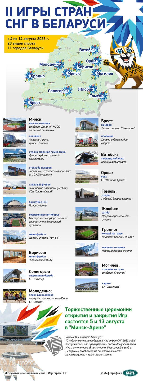 II Игры стран СНГ пройдут с 4 по 14 августа в Минске, Бресте, Витебске, Гомеле, Гродно, Могилеве, Солигорске, Орше, Молодечно и Жлобине. За награды в 20 видах спорта будут сражаться более 2 тыс. атлетов из 23 государств. Церемонии открытия (5 августа) и закрытия (13 августа) состоятся в «Минск-Арене».