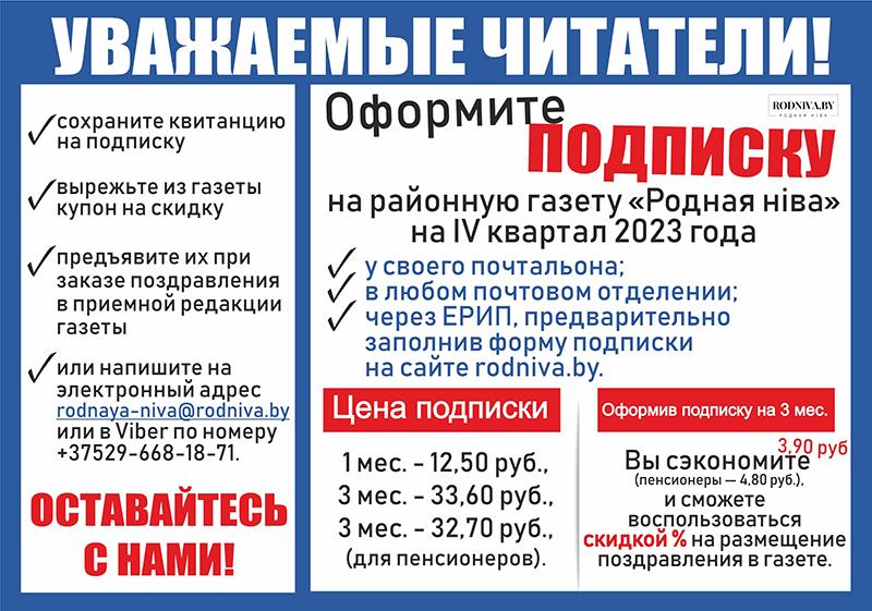 Уважаемые читатели! Завершается подписка на районную газету «Родная ніва» на IV квартал 2023 года. Если вы еще не успели стать нашими постоянными читателями, у вас есть отличная возможность сделать это до 1 октября. Не упустите шанс быть в курсе всех событий, происходящих в нашей местности.