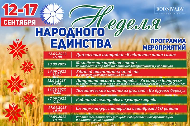 С 12 по 17 сентября в Климовичском районе пройдут мероприятия, посвященные Неделе народного единства. Это диалоговые площадки, трудовые акции, вело- и автопробеги и другое.