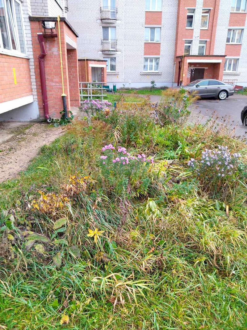 Хорошее вроде желание было у жильцов: разбить клумбы, посадить цветы. Только усердия, видно, хватило не на долго. В результате приходят в запустение клумбы, и цветы на них растут хаотично. И как итог — начинают господствовать трава и бурьян, выкосить которые среди все-таки растущих цветов довольно проблематично.