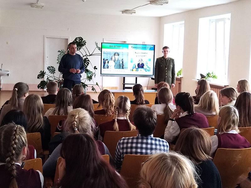Во время профориентационной встречи учащиеся с интересом слушали выступление Егора. Задавали интересующие их вопросы. И кто его знает, может в этом году кто-либо из выпускников школы пополнит ряды курсантов военного факультета БГУИР.