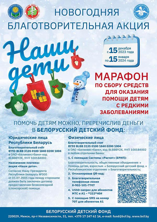 В период с 15 декабря 2023 г. по 15 января 2024 г. в Республике Беларусь будет проходить новогодняя благотворительная акция «Наши дети». Организаторами акции предусмотрено, что в период проведения акции средства будут поступать на расчетные счета РОО «Белорусский детский фонд» и использоваться для оказания помощи детям с редкими заболеваниями.