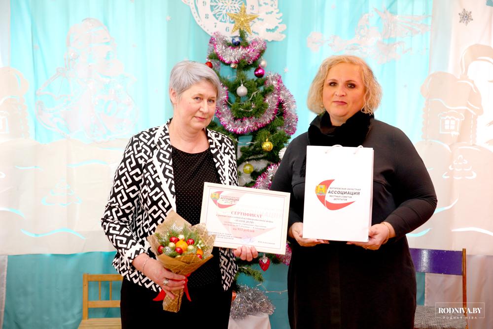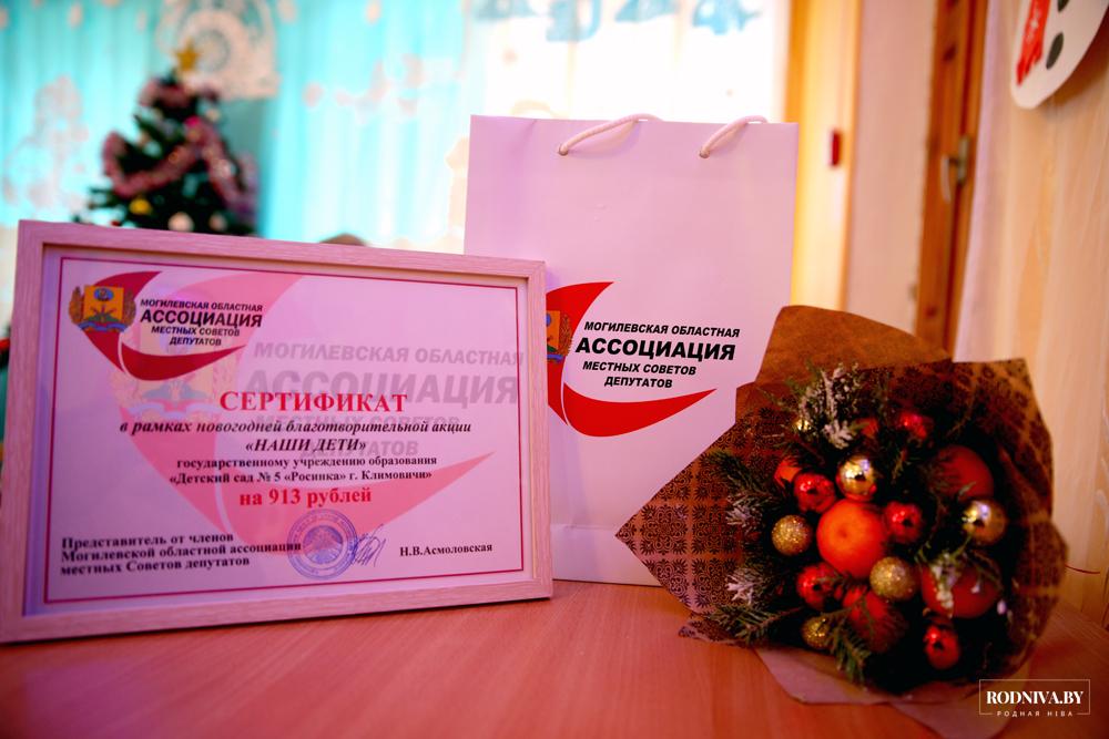 В рамках Новогодней благотворительной акции «Наши дети» лидер депутатского корпуса Климовщины Наталья Асмоловская побывала в гостях в учреждении образования «Детский сад № 5 «Росинка». Наталья Владимировна вручила руководителю организации Светлане Напольновой сертификат на сумму 913 рублей.
