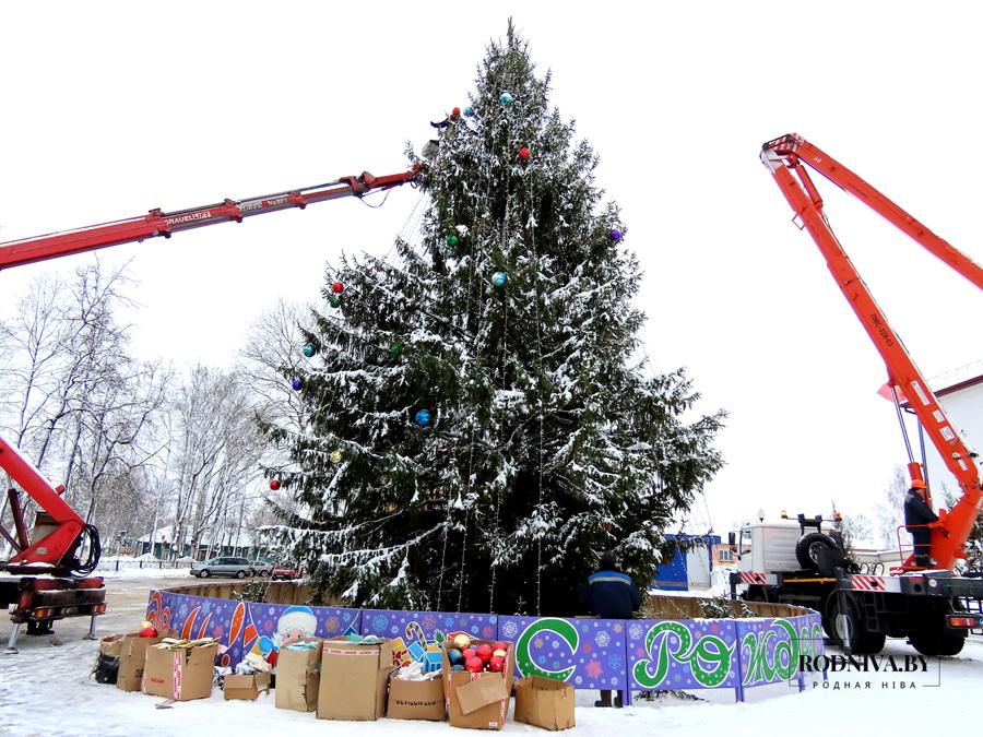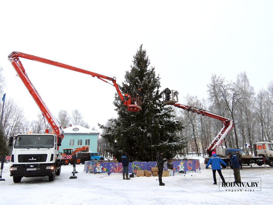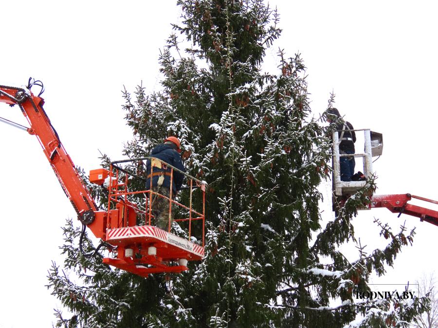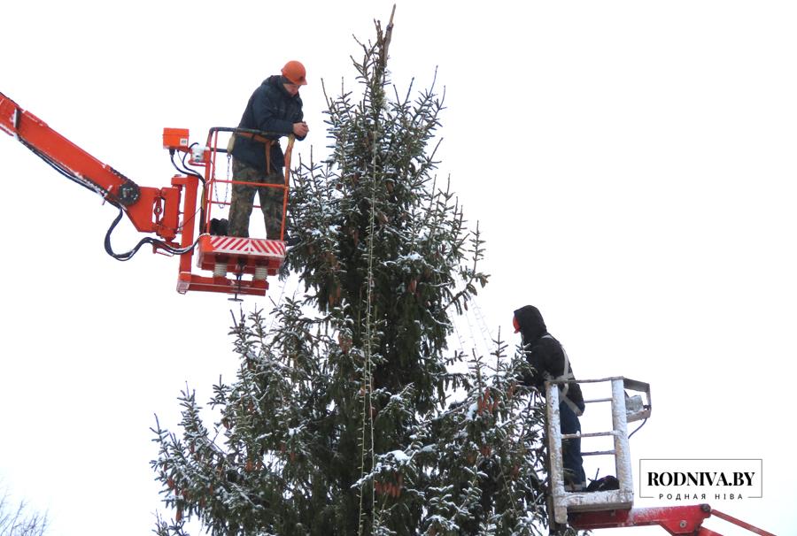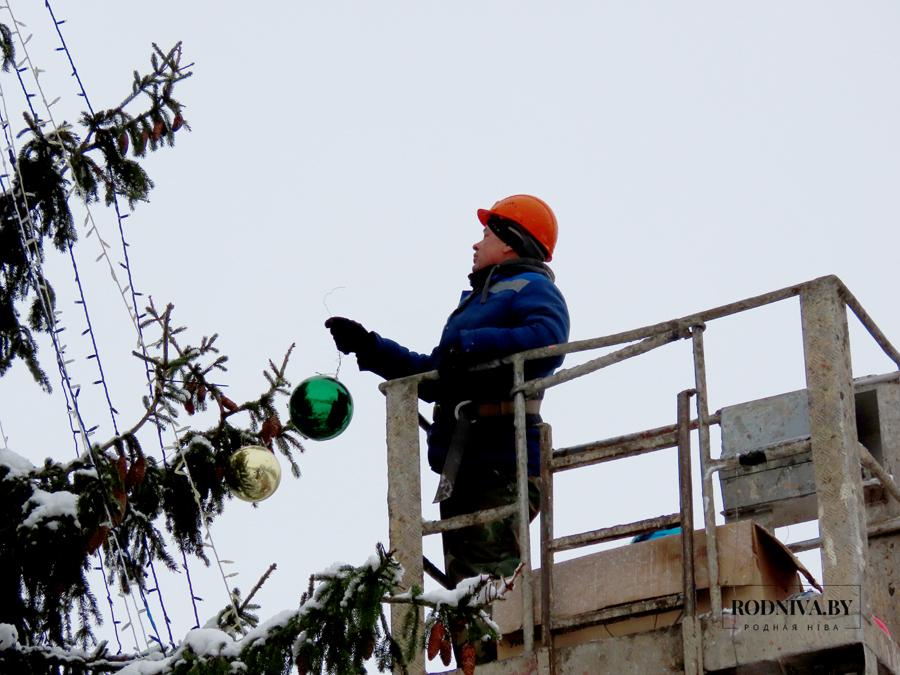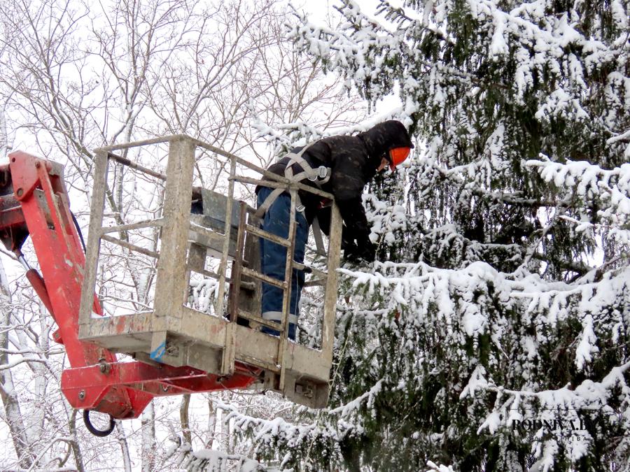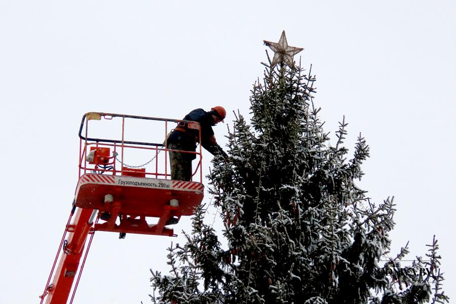 Работники Климовичского УКП «Коммунальник» украшают главную елку города на площади 50 лет Великого Октября.