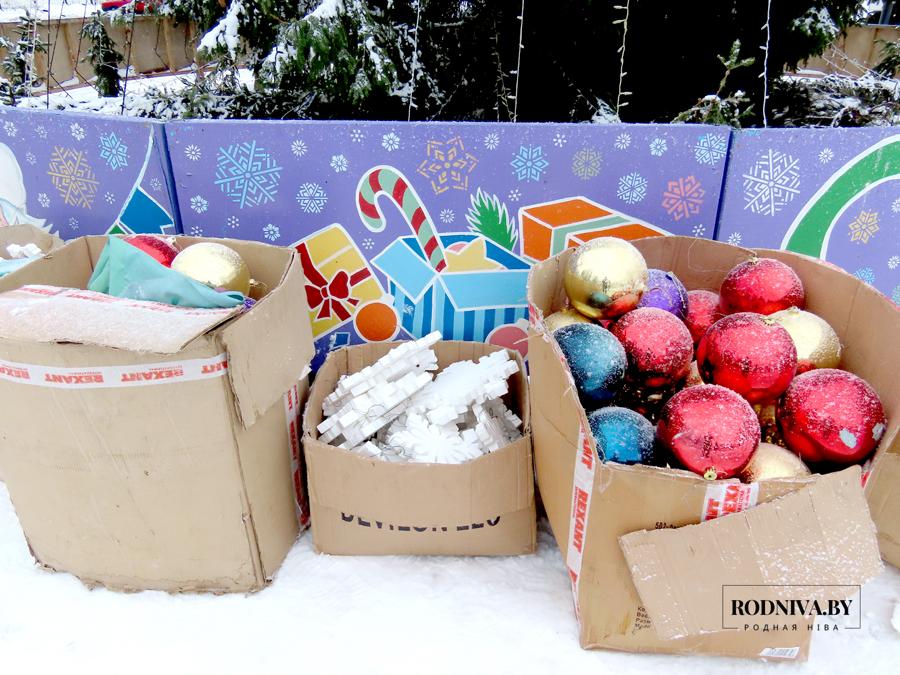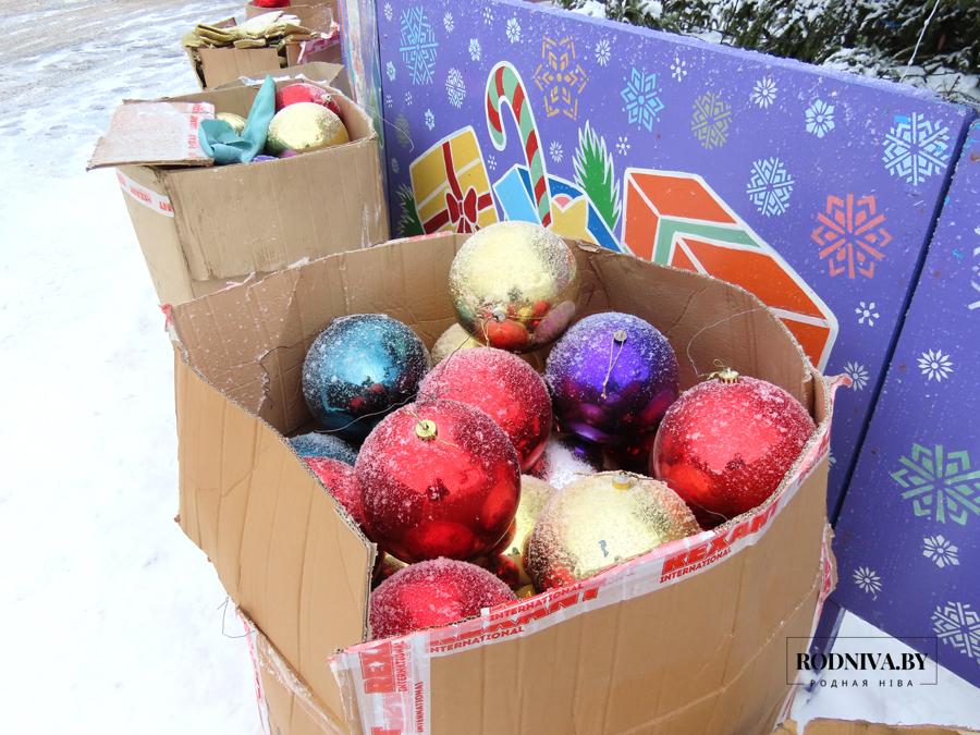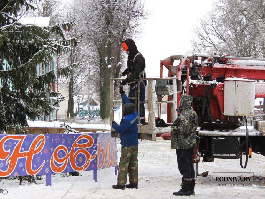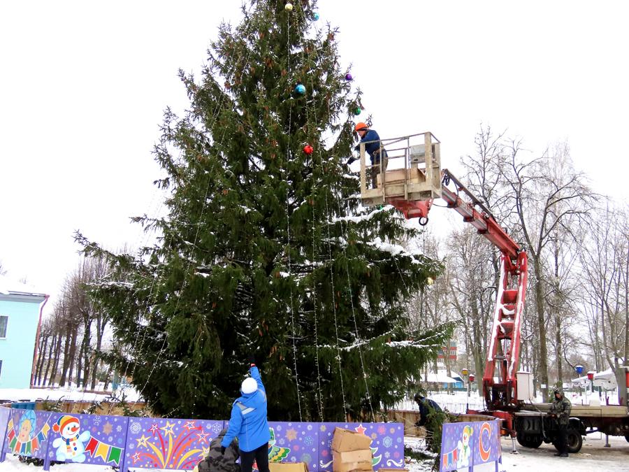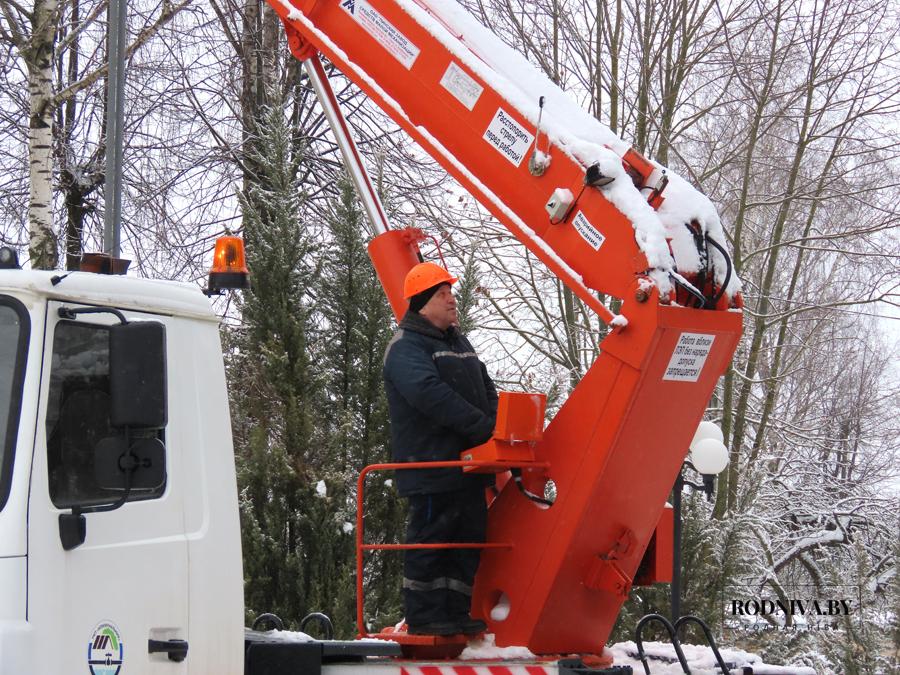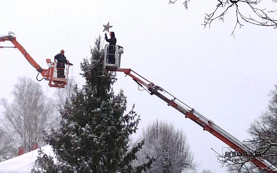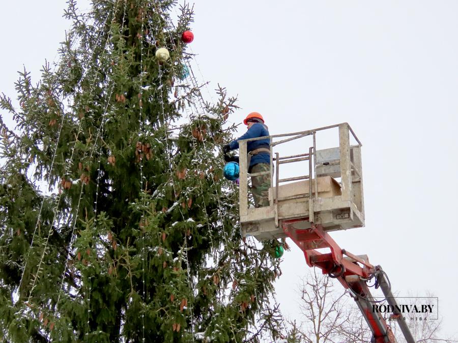 Работники Климовичского УКП «Коммунальник» украшают главную елку города на площади 50 лет Великого Октября.