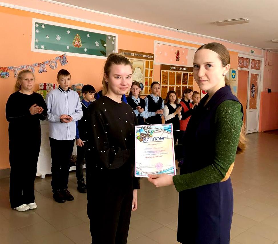 Первый секретарь Климовичского райкома ОО «БРСМ» Алина Рябцева встретилась с учащимися Лобжанской средней школы Климовичского района. Она рассказала школьникам о деятельности общественного объединения. Также лидер молодежной структуры наградила Валерию Шлапакову дипломом участника районного конкурса «Нет наркотикам».