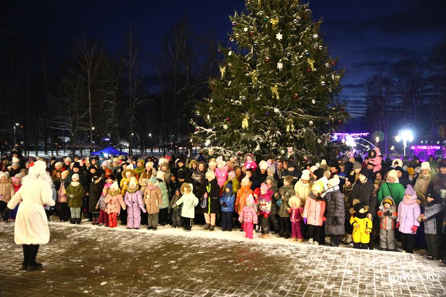 С помощью волшебного огонька главные Дед Мороз и Снегурочка заставили светиться яркими огнями праздничную иллюминацию на красавице елке.