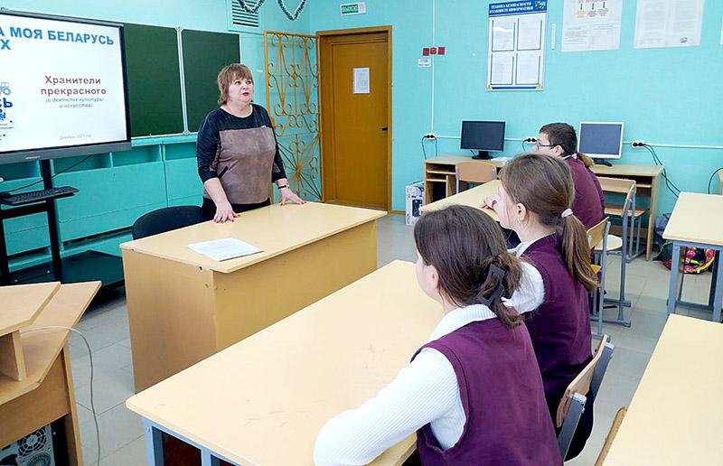 Классный руководитель 10 класса Александр Сакович рассказал детям о достижениях страны в области культуры, о знаменитых режиссерах и сценаристах, писателях и поэтах. Поговорили об известных танцевальных коллективах, фестивалях, проходящих в Беларуси.