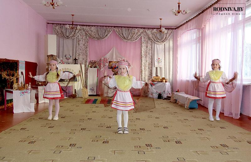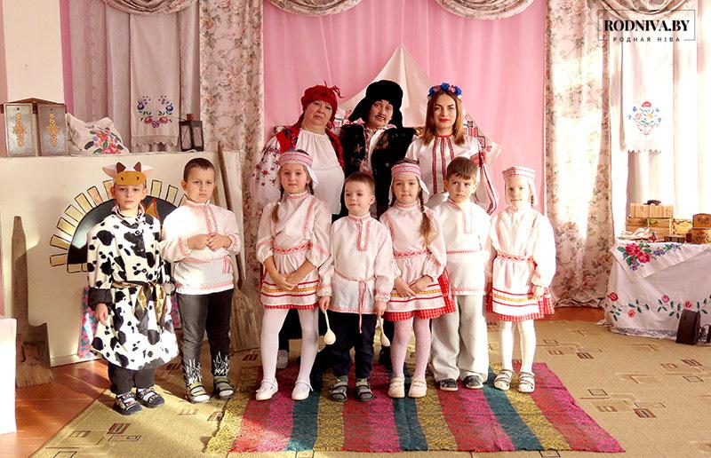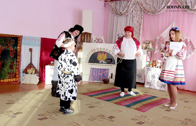 У госці да Гаспадыні (яе ролю выконвала музычны кіраўнік) у беларускую хату прыйшлі Дзед і Баба (выхавацелі дашкольнай адукацыі Алена Калугіна і Наталля Масальская).