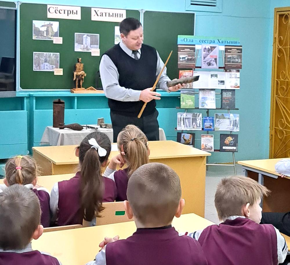 Об истории сожженных белорусских населенных пунктов и деревне Олы ребятам рассказал руководитель по военно-патриотическому воспитанию Александр Блюмер: