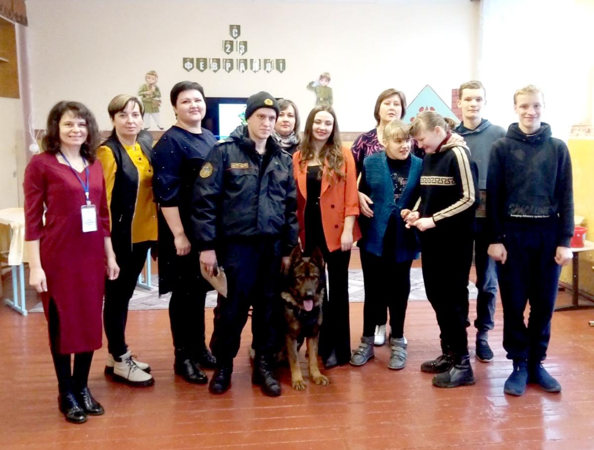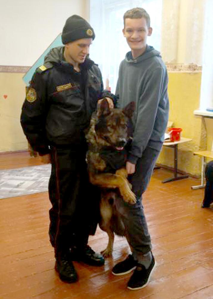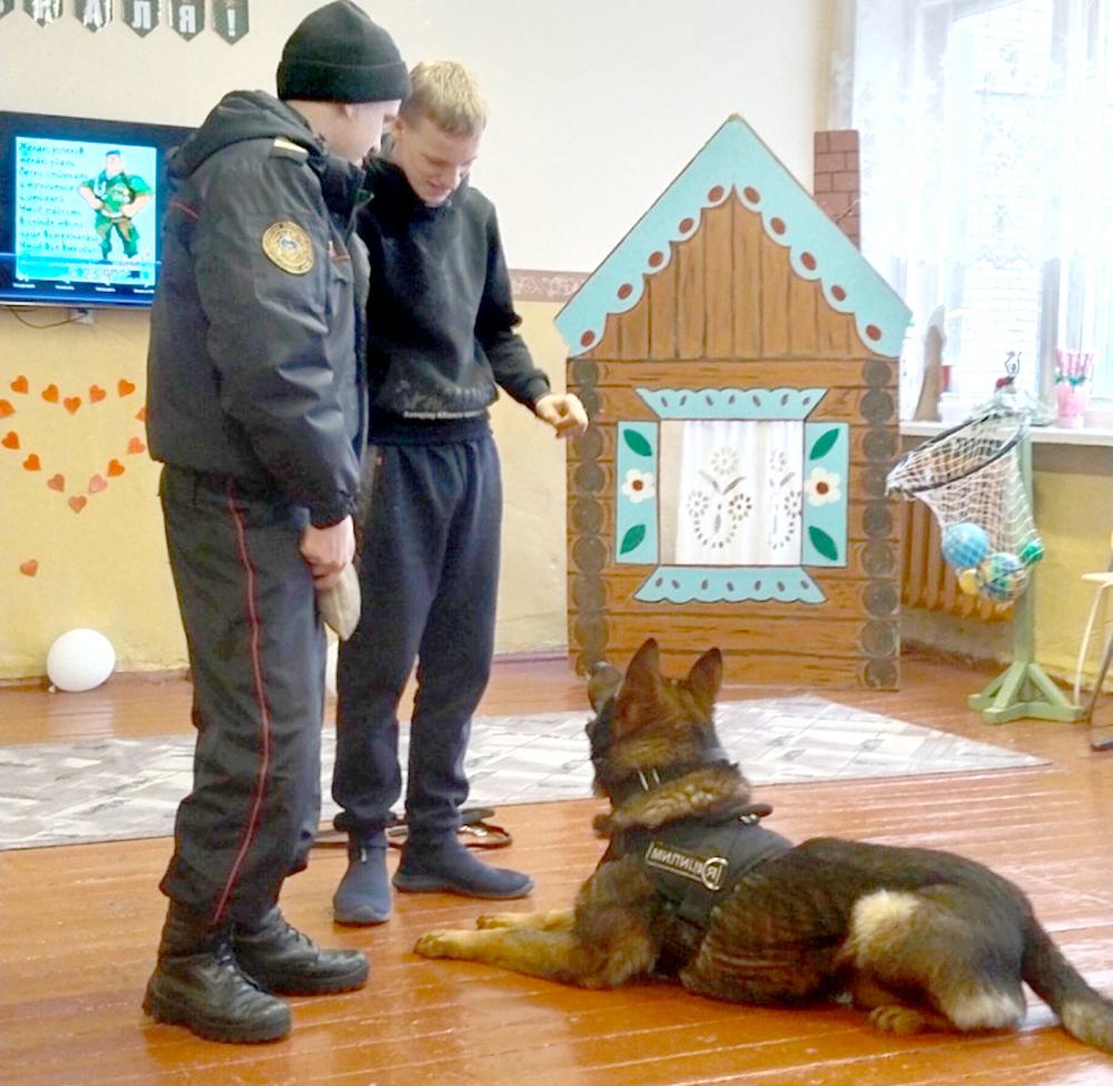 Милиционер-кинолог отдела охраны со своим верным четвероногим другом по кличке Браско побывал в гостях в ГУО «Климовичский районный ЦКРОиР». Ребята увидели, как в различных ситуациях ведет себя дрессированная собака: четко выполняет команды, находит спрятанную вещь.