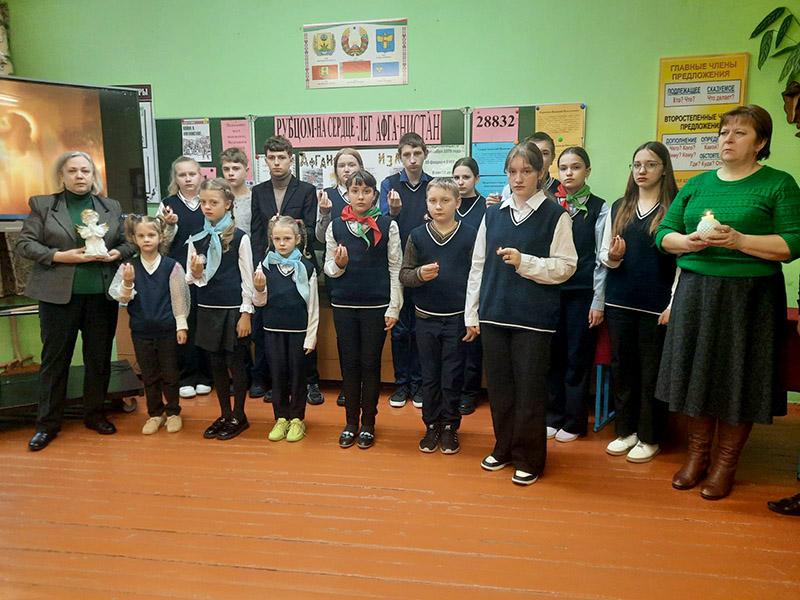 В конце информационного часа учащиеся зажгли свечи в честь погибших во время Афганской войны и почтили их память минутой молчания.