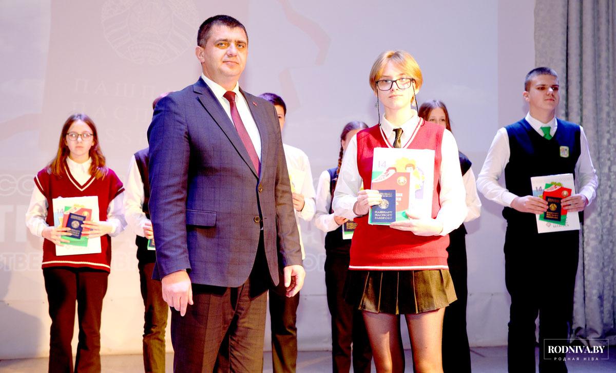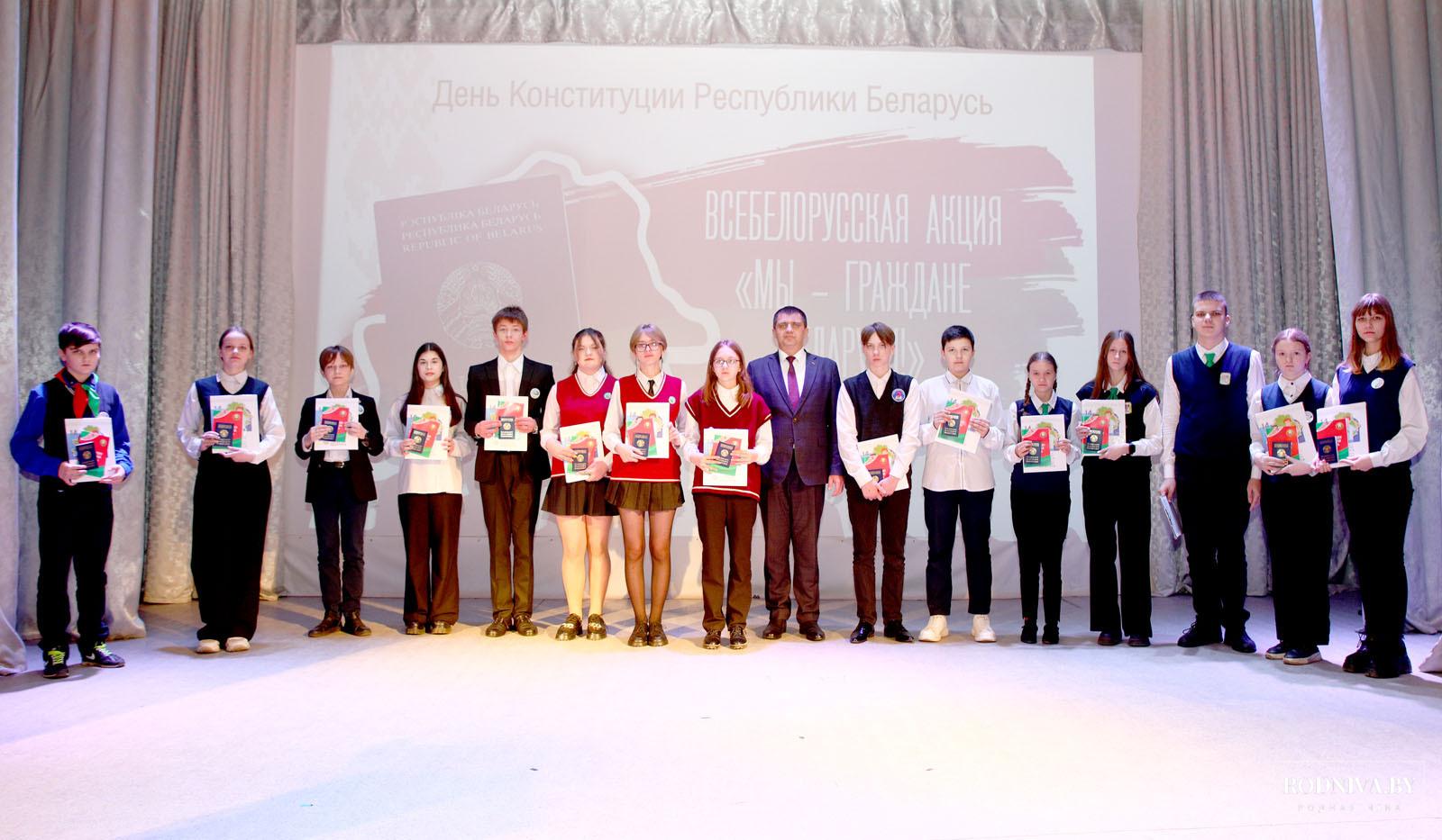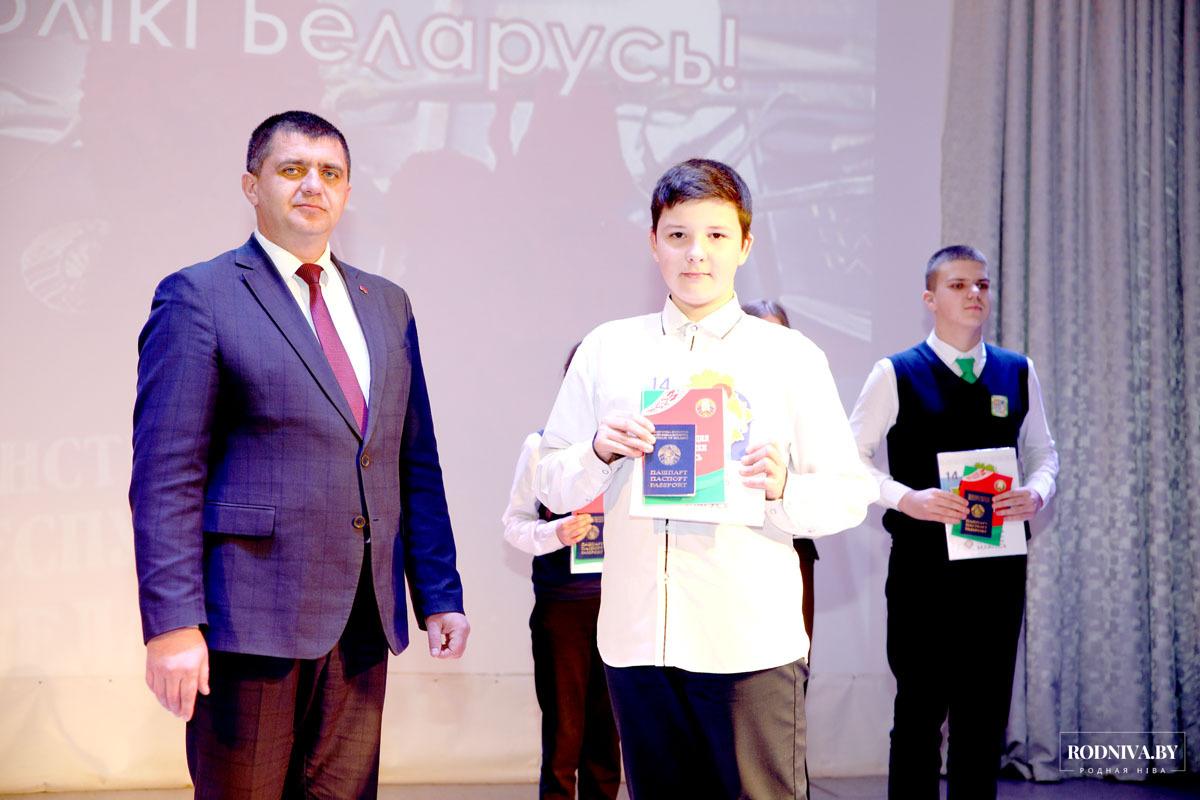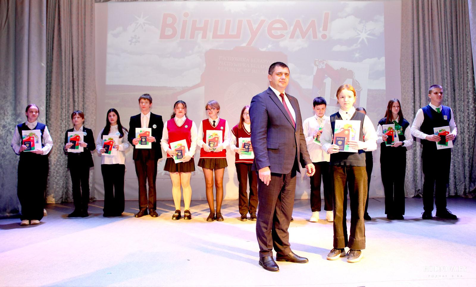 Председатель райисполкома вручил паспорта и памятные книги «Я — гражданин Республики Беларусь» Тимуру Доменикану, Анастасии Усовой, Дарье Гершановой (учащимся районной гимназии), Александру Ермолову (учащемуся Тимоновской средней школы), Александру Гапеенко, Мирославе Шашковой (средняя школа № 1), Ивану Степаненко, Кристине Кулешовой, Кириллу Гончарову (средняя школа № 3), Александре Купреевой, Елизавете Слепцовой, Владимиру Хайкову, Снежане Белоштентовой (средняя школа № 4), Софии Андрюшкиной, Дарье Зуевой (Барсуковская базовая школа).