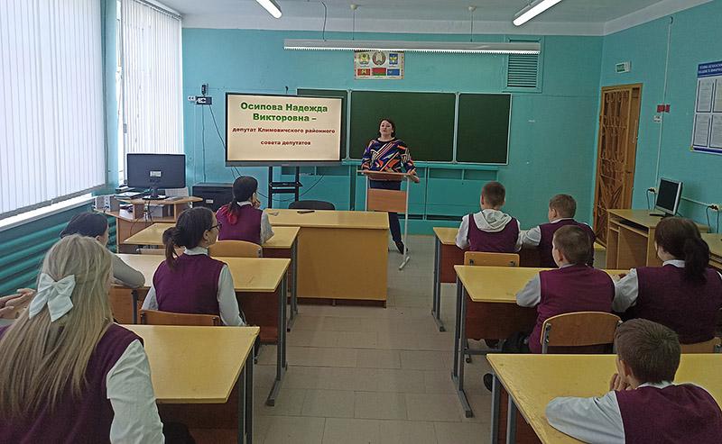 На встречу к школьникам пришла депутат Климовичского районного Совета депутатов по Милославичскому избирательному округу Надежда Викторовна Осипова. Она рассказала учащимся, как устроена вертикаль власти в стране, о деятельности районного Совета депутатов и районного исполнительного комитета.