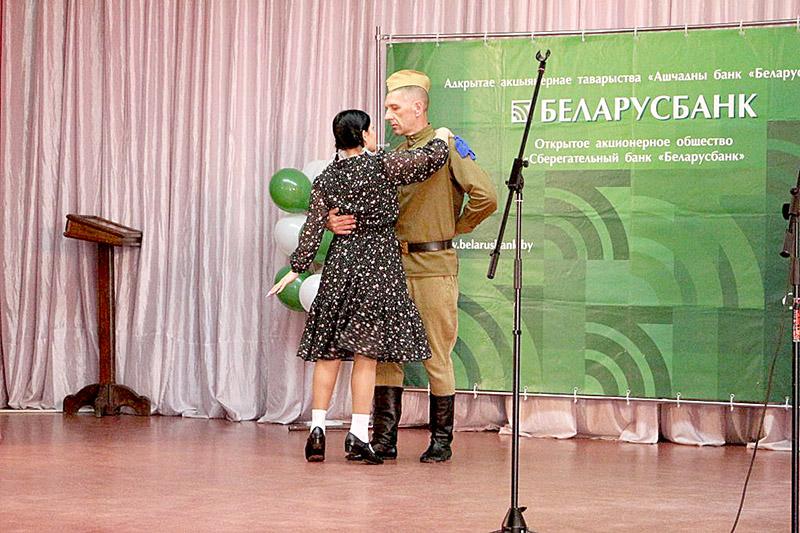 Театрализованный хореографический номер «Майский вальс» представили заведующий сектором розничного и корпоративного бизнеса Ольга Новгородская и ведущий специалист административно-хозяйственной службы Андрей Пронькин.