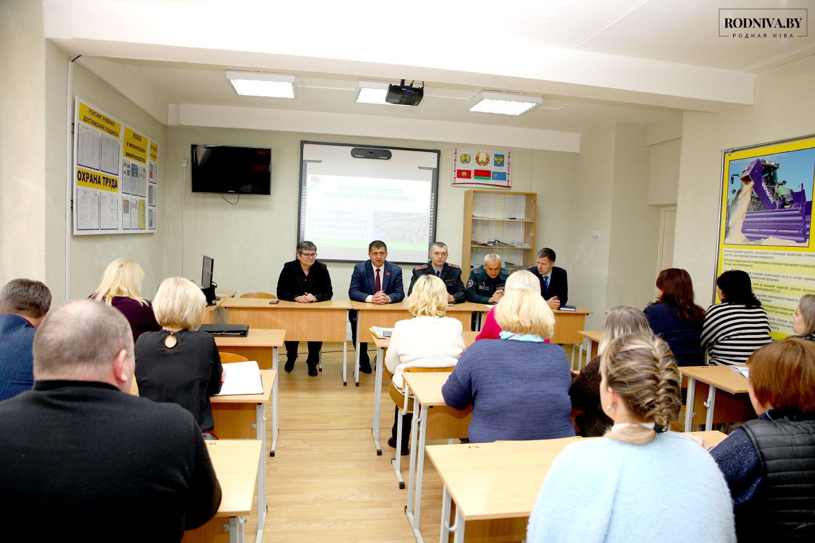 Первое заседание седьмого Всебелорусского народного собрания состоится 24 — 25 апреля в Минске. По поручению Главы государства Александра Григорьевича Лукашенко это масштабное мероприятие должно пройти на самом высоком уровне. Об особой роли ВНС говорили и на встрече председателя райисполкома Дмитрия Хайновского в аграрном колледже в рамках Единого дня информирования населения.