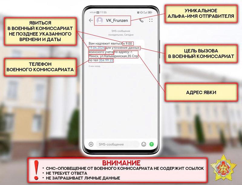 В настоящий момент оператором связи каждому военкомату присвоено так называемое альфа-имя. Оно будет значиться в графе «отправитель». Сообщение будет содержать информацию о том, по какому адресу и когда следует явиться гражданину и телефон для справок. Сообщение от военного комиссариата не содержит ссылок, не требует ответа. Личные или паспортные данные по телефону военкомат также никогда не запрашивает.