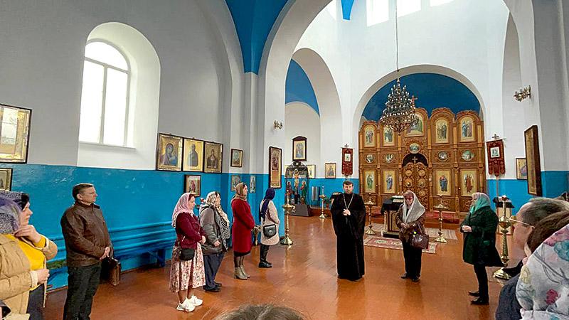 По приезде гости мероприятия отправились в Свято-Вознесенский храм, где встретились с настоятелем Милославичской и Звенчатской церквей отцом Николаем. Он рассказал собравшимся историю храма, а также о текущих и предстоящих православных праздниках.