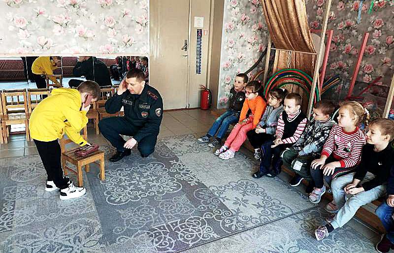 Вместе со спасателем ребята повторили номера экстренных служб, попробовали условно позвонить диспетчеру МЧС и сообщить о пожаре.