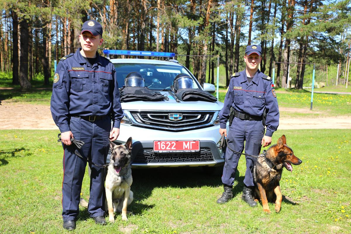 Кинологи группы задержания Климовичского отдела Департамента охраны Артем Лавренко и Денис Авхименко. Путь в милицию у них одинаковый: школа — учеба в Климовичском лицее — служба в армии, а после демобилизации — отдел Департамента охраны. Обоих служить в данном отделе сагитировали друзья, уже служившие там.