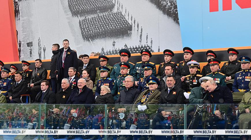 Вместе с другими прибывшими в Москву лидерами стран и ветеранами Александр Лукашенко наблюдал за парадом с трибуны.