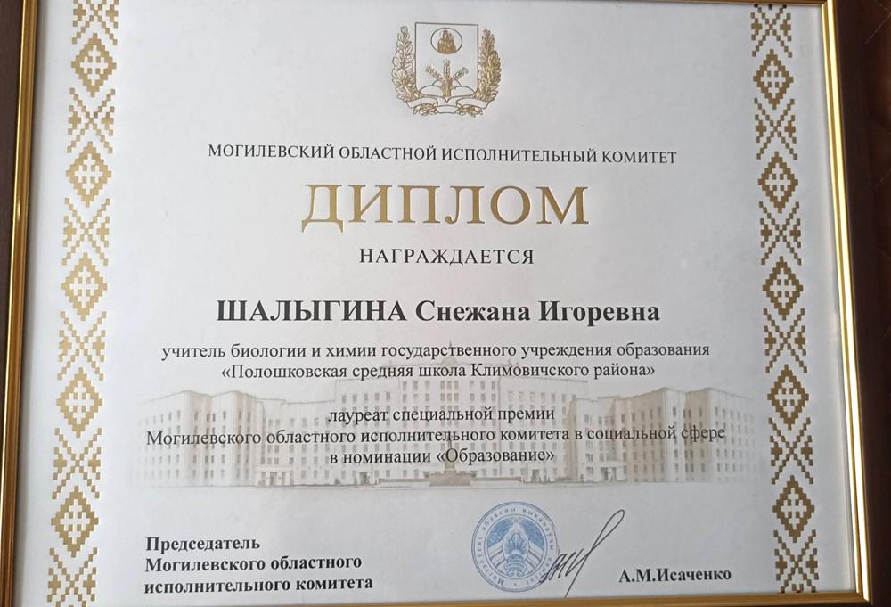 Учитель биологии и химии государственного учреждения образования «Полошковская средняя школа Климовичского района» Снежана Шалыгина стала лауреатом специальной премии Могилевского областного исполнительного комитета в социальной сфере в номинации «Образование».