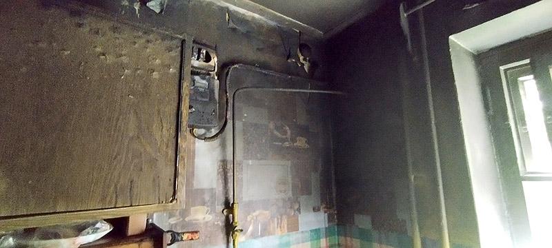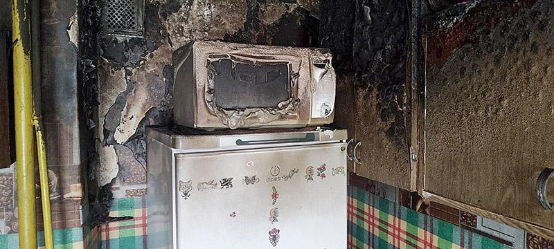 В результате пожара повреждены навесные шкафы в кухне, микроволновая печь, закопчен потолок, уничтожена задняя сторона холодильника.