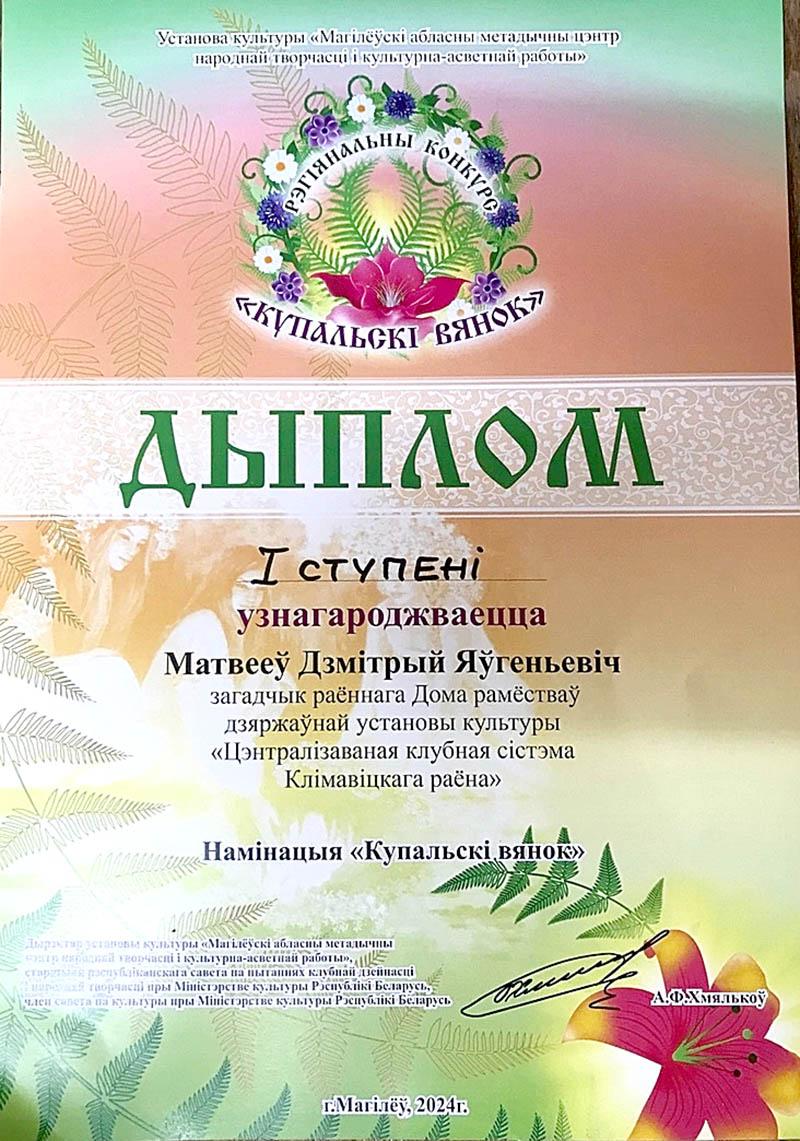 В числе победителей был и климовчанин Дмитрий Матвеев, заведующий районным Домом ремесел ГУК «Централизованная клубная система Климовичского района».