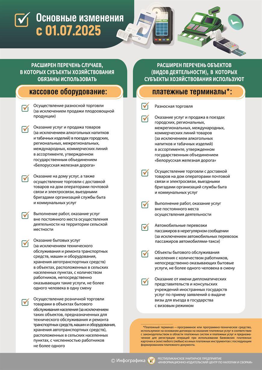 Кроме того, в соответствии с постановлением Совета Министров Республики Беларусь и Национального банка Республики Беларусь от 6 июля 2011 г. № 924/16 «Об использовании кассового и иного оборудования при приеме средств платежа» (в редакции постановления Совета Министров Республики Беларусь, Национального банка Республики Беларусь от 23 октября 2023 г. № 712/19) с 1 июля 2025 г. расширены: