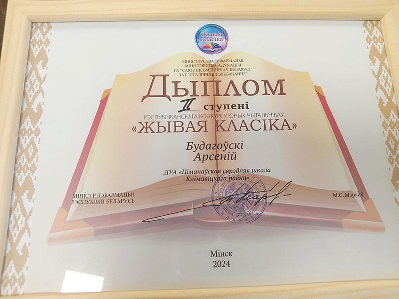 Очередным успехом порадовал земляков учащийся 6 «А» класса Тимоновской средней школы Арсений Будаговский. Мальчик стал обладателем Диплома II степени республиканского конкурса юных чтецов «Живая классика», который проходил в Минске. Организаторами мероприятия стали Министерства информации и образования Республики Беларусь, общественное объединение «Союз писателей Беларуси», ЗАО «Столичное телевидение».