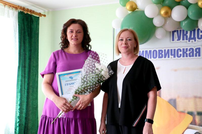Председатель Климовичского районного объединения профсоюзов Алеся Котова вручила благодарственное письмо бухгалтеру Екатерине Тимошенко.