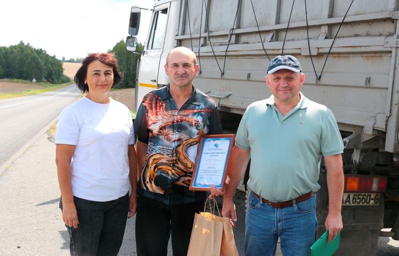 Награды за перевезенную тысячу тонн нового урожая в этот раз получил водитель ОАО «Племзавод «Тимоново» Владимир Жариков. Благодарственное письмо Климовичского районного объединения профсоюзов, а также денежный подарок вручили труженику села председатель районного объединения профсоюзов Алеся Котова и председатель райкома профсоюза работников агропромышленного комплекса Александр Голочевский.