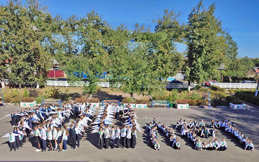 На площадке около своего учреждения ребята выстроились в форме цифры «100» и слова «лет». Фотограф с крыши здания запечатлел момент.