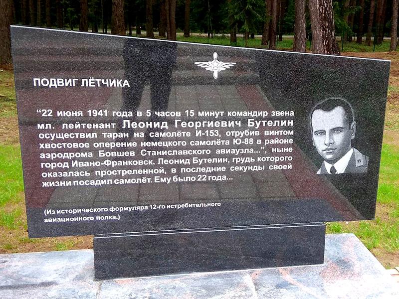 Он погиб в первый же час войны. На рассвете 22 июня немецкие самолеты начали бомбить аэродром. Леониду Бутелину удалось поднять в небо свой И-153. Очередью из пулемета советский летчик сумел сбить один вражеский самолет. Поймал в перекрестие прицела второй. Нажал на гашетку… Но пулемет молчал — кончились патроны. Тогда советский сокол решился на таран. Он зашел фашисту сзади и винтом отрубил юнкерсу хвостовое оперение. Вражеский самолет стал падать. Это было 22 июня в 5 часов 15 минут…